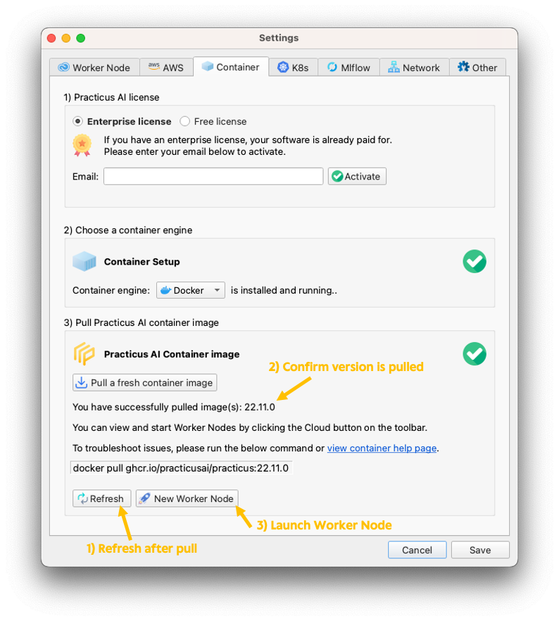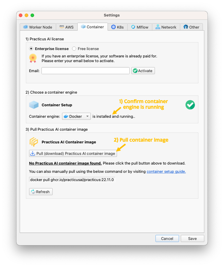 - Open Practicus AI App settings (preferences in macOS) dialog and navigate to the Container section.