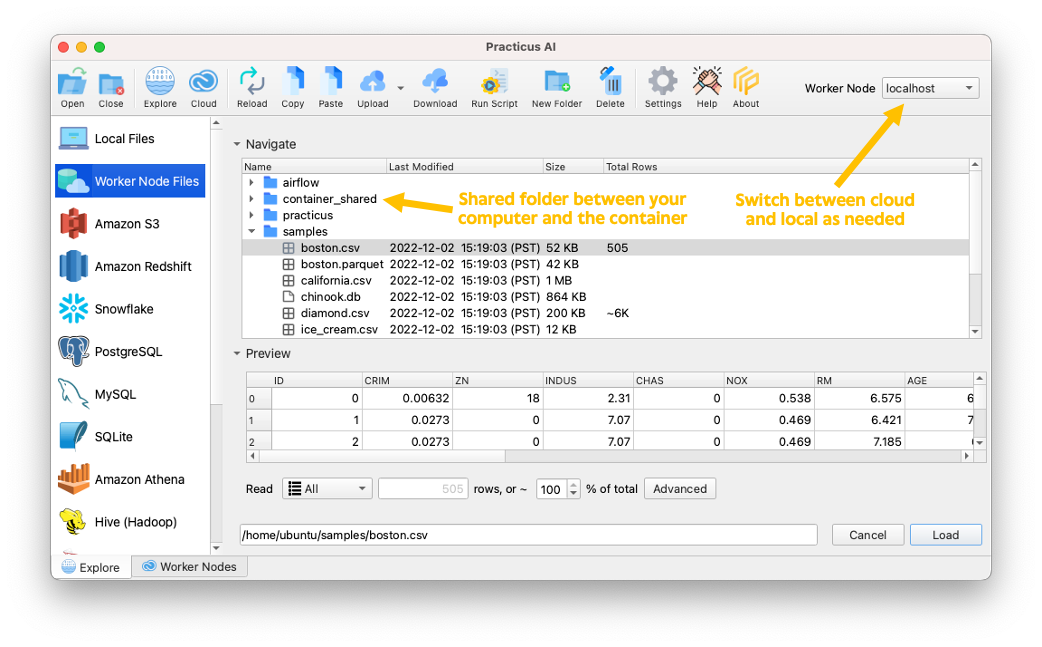 - Practicus AI app also attaches (mounts) container_shared folder, so you can easily copy files back and forth between your file system and the container. Simply open Windows Explorer (Finder in macOS), navigate to: your home folder / practicus / container_shared and copy files. Then navigate to Cloud Worker Files in Explore tab, and the files you copied will be visible under container_shared folder. Click Reload button at the top if you recently copied files.
