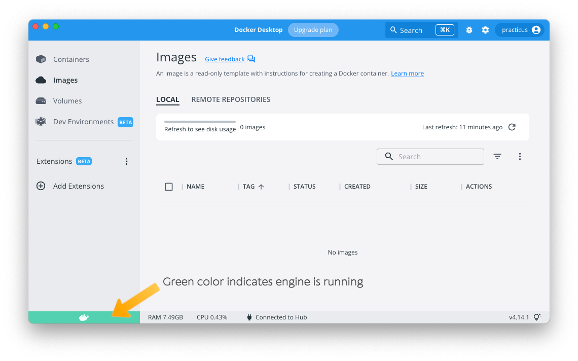 - Once the container pull is completed, go back to the app and click refresh to view active Practicus AI images on your computer. Confirm you successfully pulled the container image.