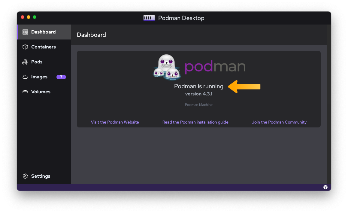 Once the installation is completed, simply run Docker or Podman Desktop and confirm the container engine is running.