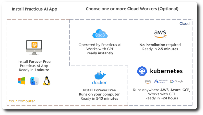 You can see a simplified view of Practicus AI setup options below.