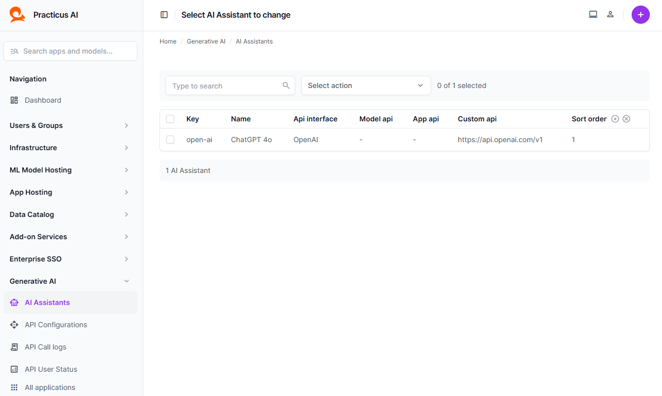 - From the AI Assistants list, select the checkbox next to an Assistant or click its name to view details.