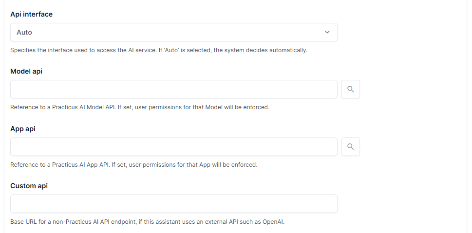 - Model API, App API, Custom API: The configured back-end for the AI.