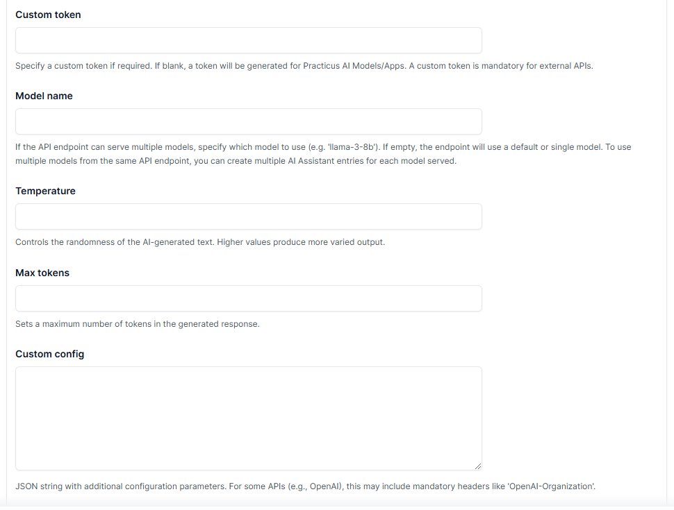 - Use this field to set a base URL for a non-Practicus API endpoint (e.g., OpenAI’s