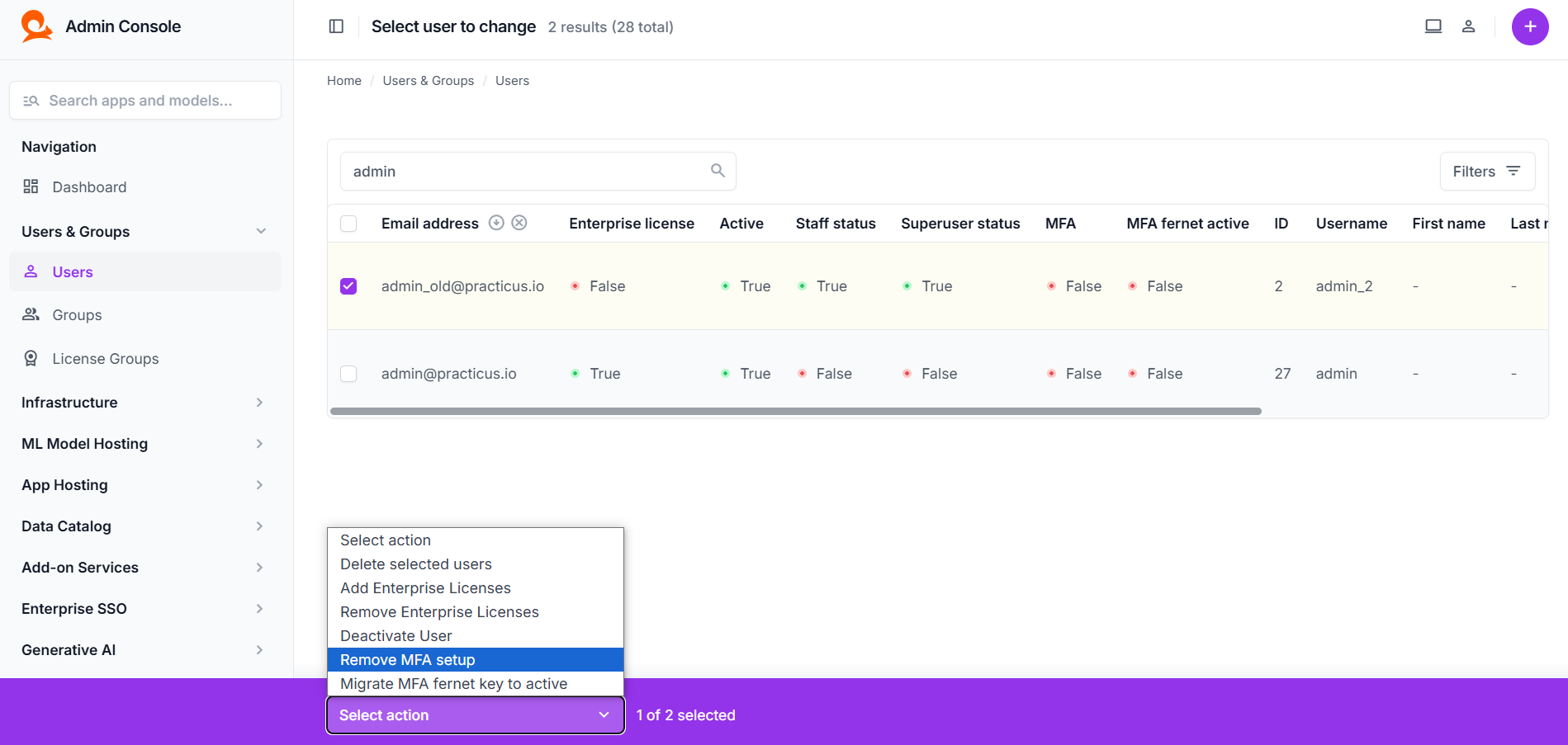 - Remove MFA setup: Resets the selected user’s MFA configuration. The user will have to set it up again when they log in next time.