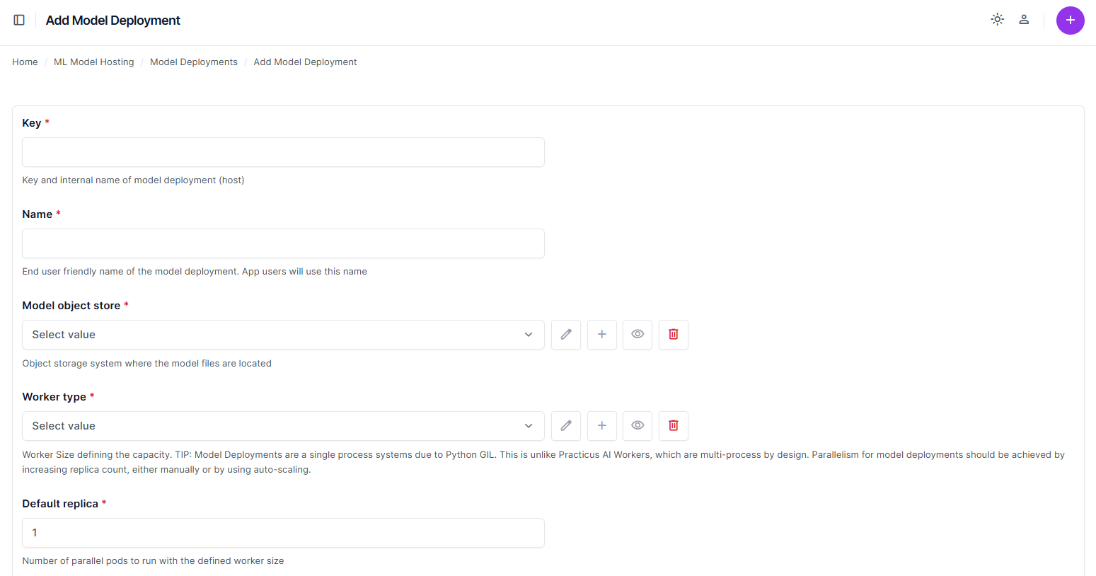 This document provides details for configuring model deployment settings within the Practicus AI platform. It focuses on essential fields and configurations required to create, modify, and manage model deployments efficiently.